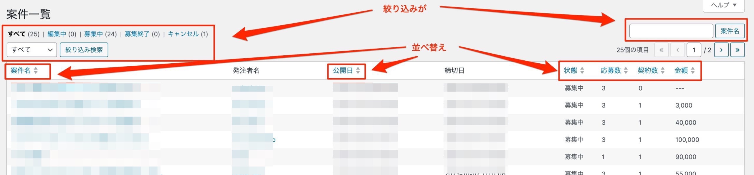 募集した案件にどのような応募が届いているかを、まとめてチェックできるページです。 応募してくれた人の名前やコメントの数で並べ替えたり、気になるキーワードで検索したりするのも簡単です。