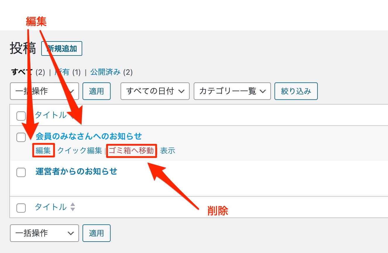 掲載が終了したコンテンツや、不要なデータを削除・整理する方法です。 運営管理画面の【投稿】>【投稿一覧】を表示し、該当コンテンツのタイトル下に表示される【ゴミ箱へ移動】を選択してください。