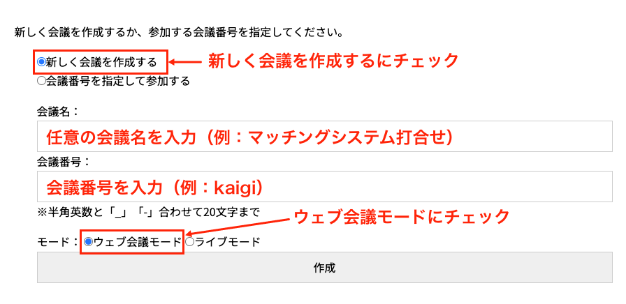 オンラインでの話し合いを始めるときは、まず「新しく会議を作成する」にチェックを入れます。 次に、分かりやすい「会議名」と、合言葉になる「会議番号(例:kaigi)」を自由に決めて入力してください。この会議番号は、プライベートメッセージなどで事前に参加メンバーに伝えてください。